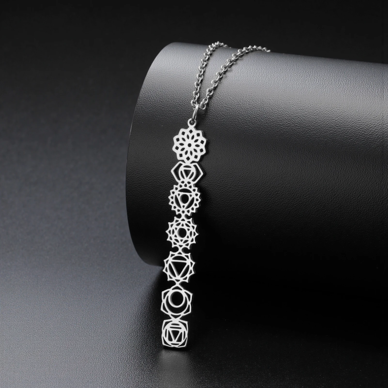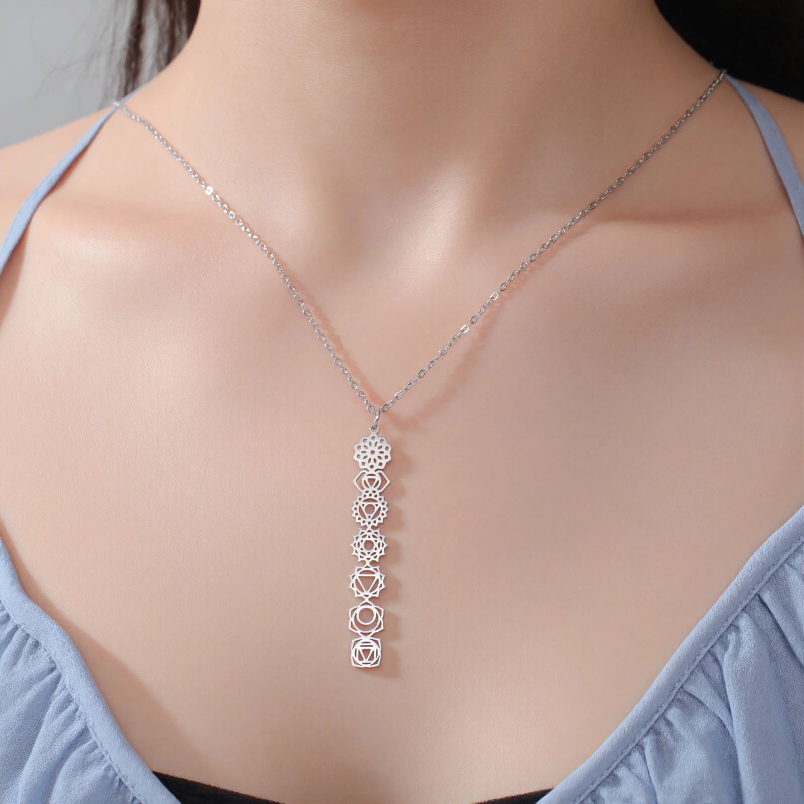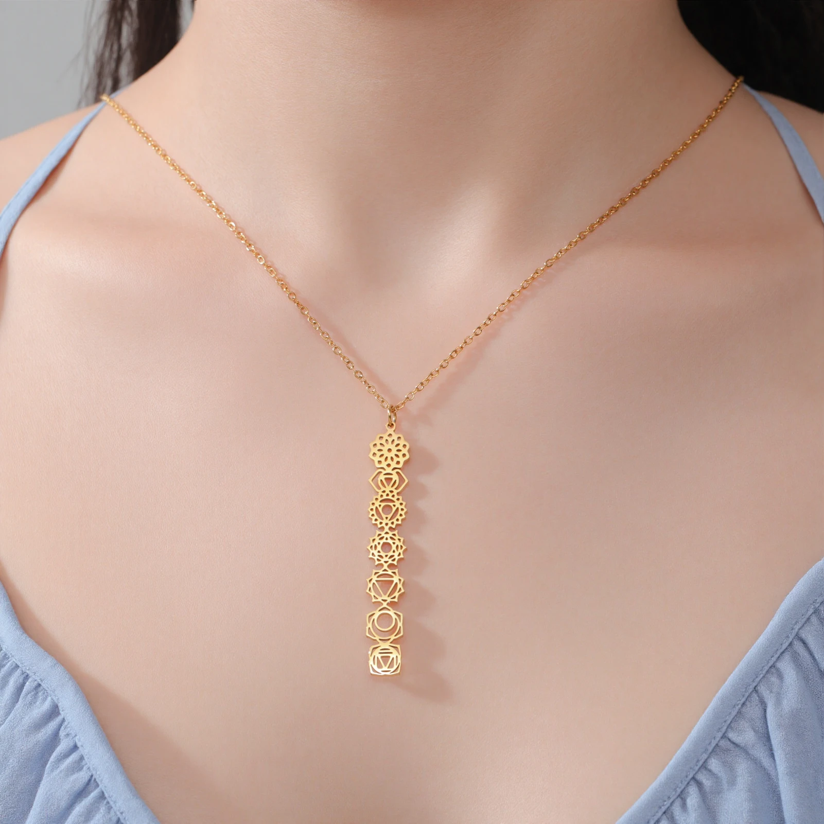 The 7 Chakra Pendant Necklace captures balance and beauty in a minimalist design. Crafted in stainless steel and available in gold or silver tones, it features seven finely detailed geometric pendants arranged in a vertical line — each symbol representing harmony and mindful living.