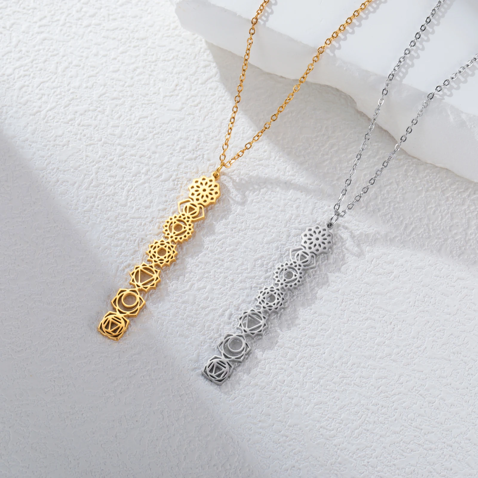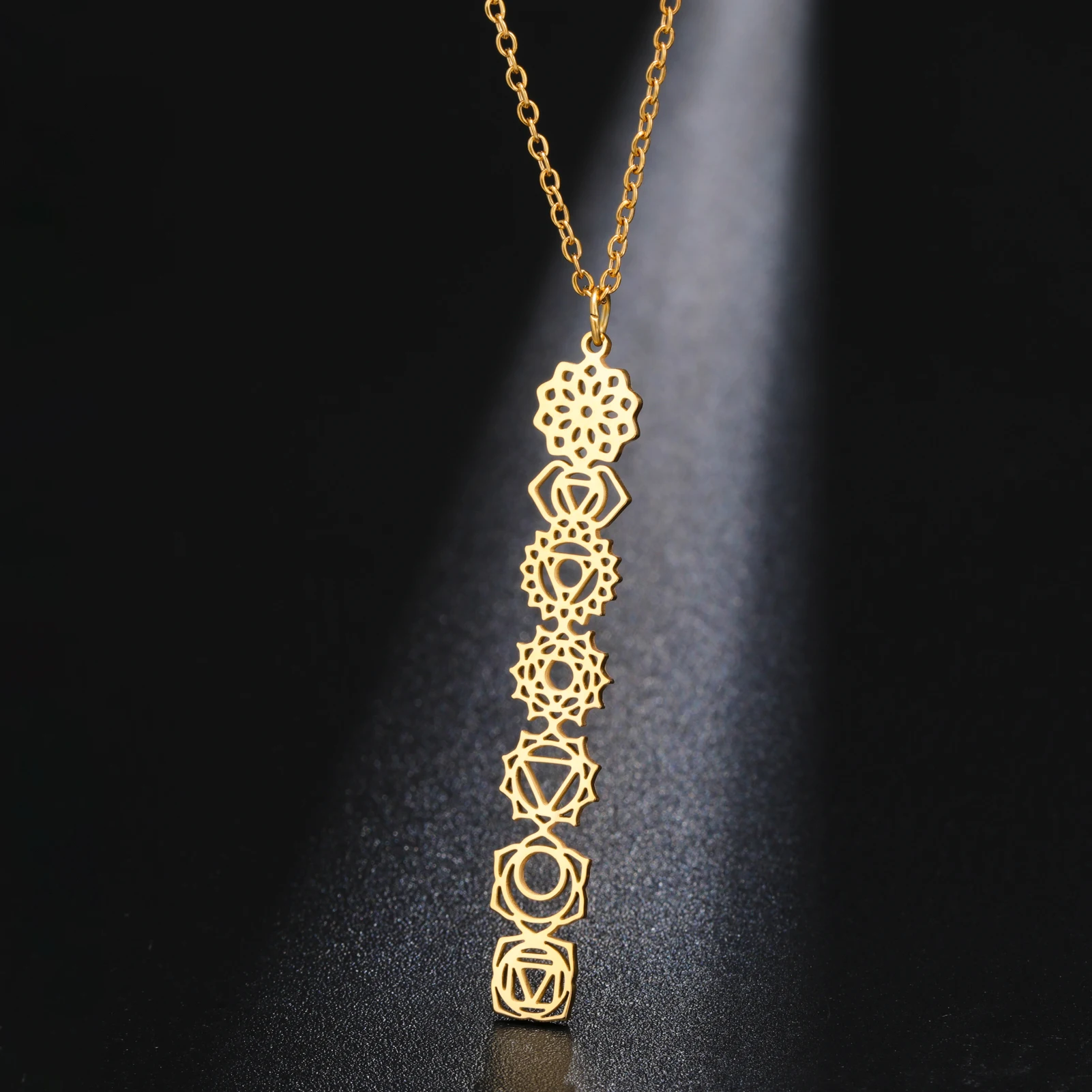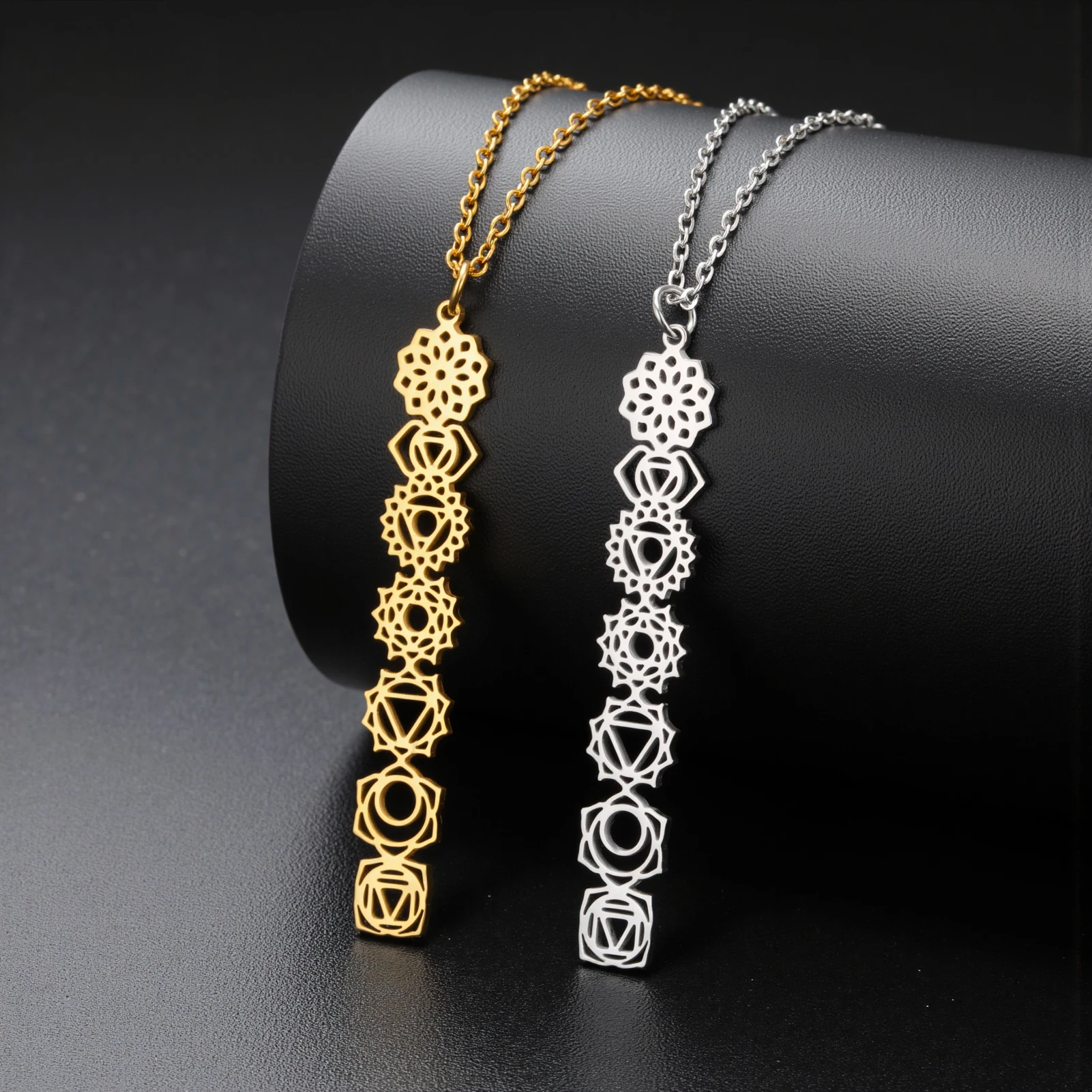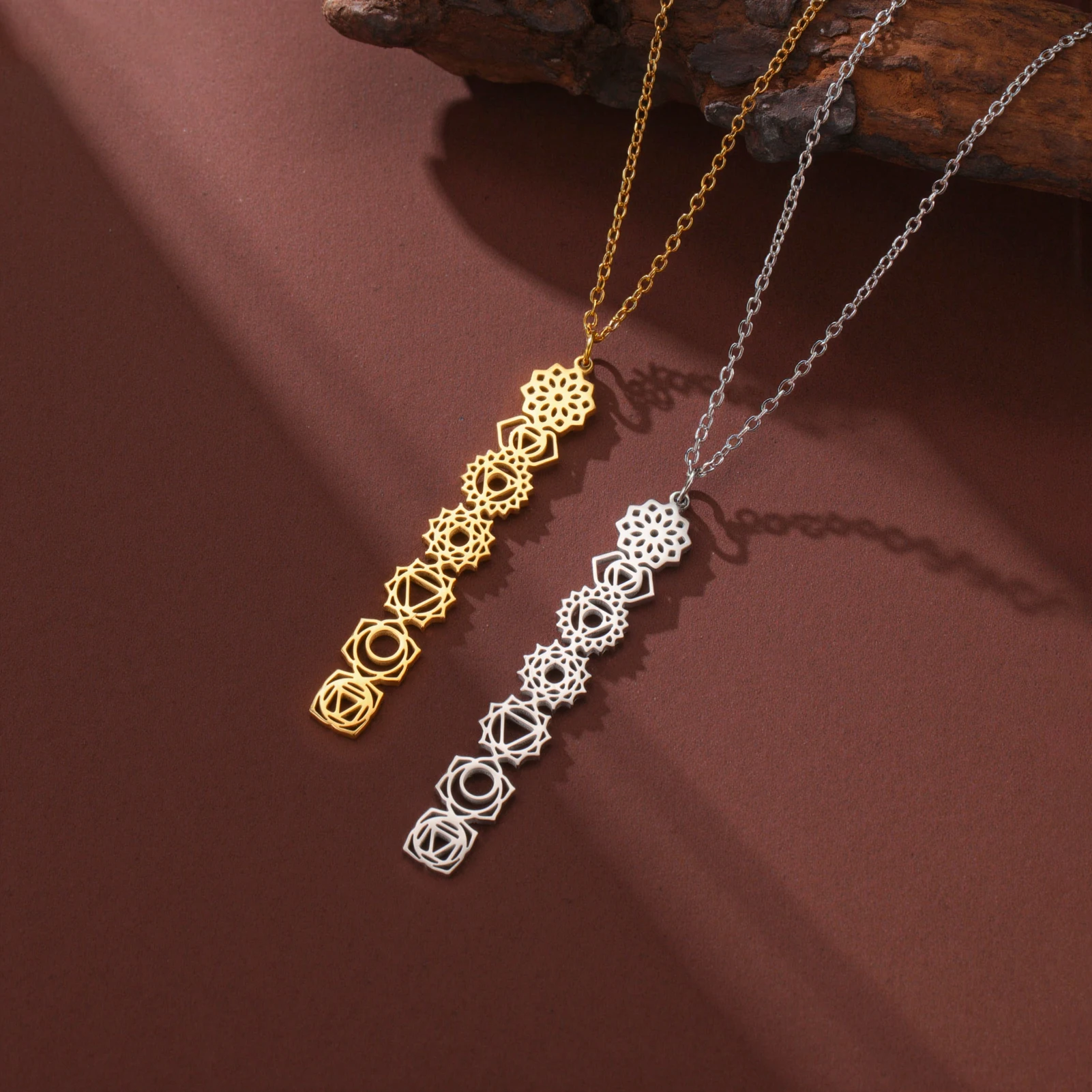The 7 Chakra Pendant Necklace captures balance and beauty in a minimalist design. Crafted in stainless steel and available in gold or silver tones, it features seven finely detailed geometric pendants arranged in a vertical line — each symbol representing harmony and mindful living.