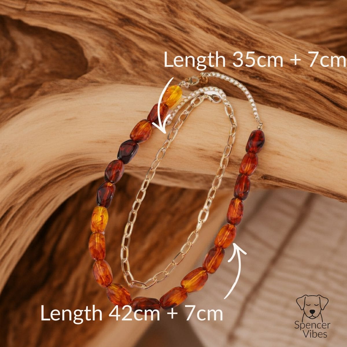 Each bead has a smooth, polished finish that catches the light gently. Because of this, the necklace feels warm and tactile rather than glossy or sharp. The alternating bead and chain design also creates visual rhythm, which helps the piece sit comfortably against clothing.