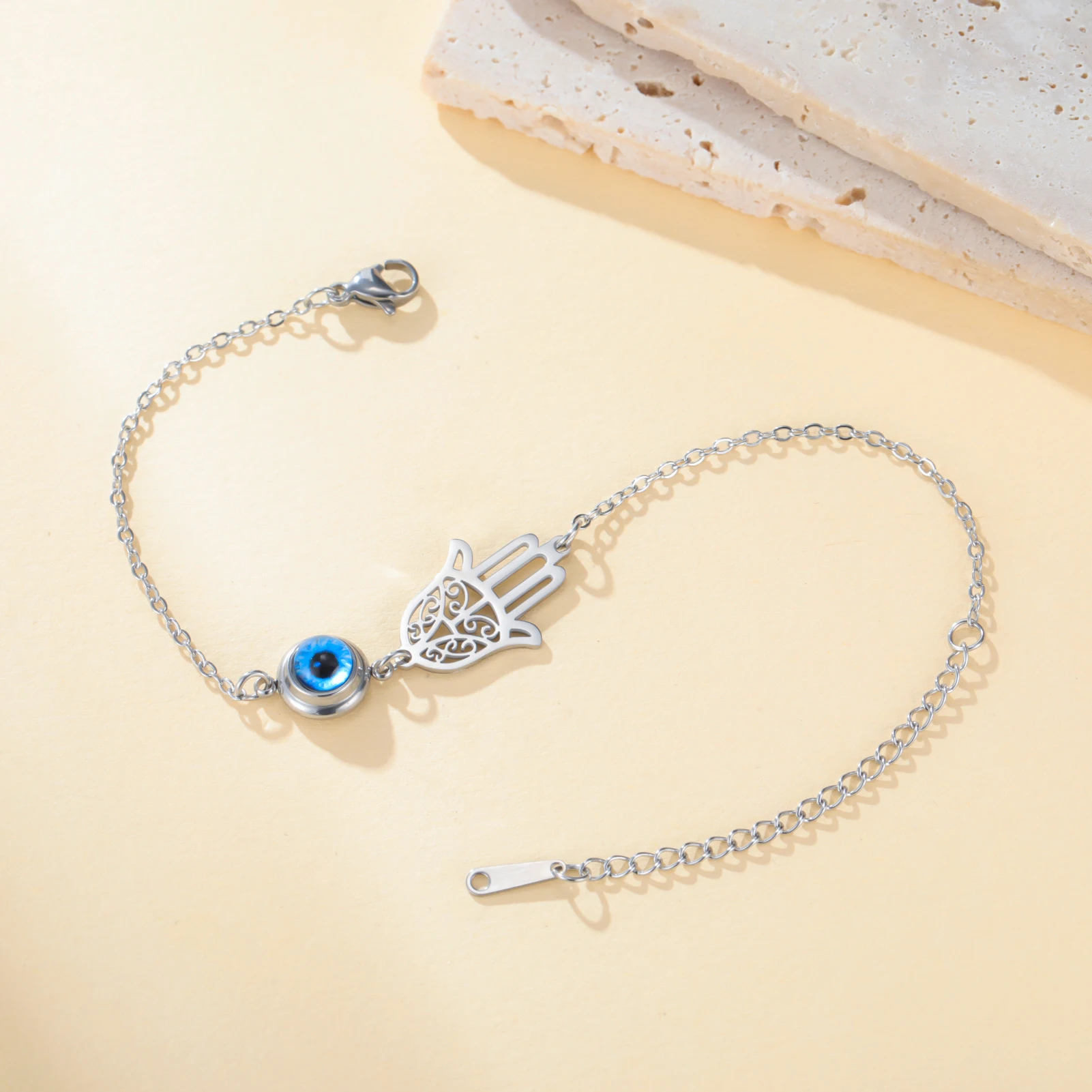 Timeless, detailed, and beautifully balanced, the Blue Eye Hamsa Hand Bracelet adds a touch of mindful elegance to any look.