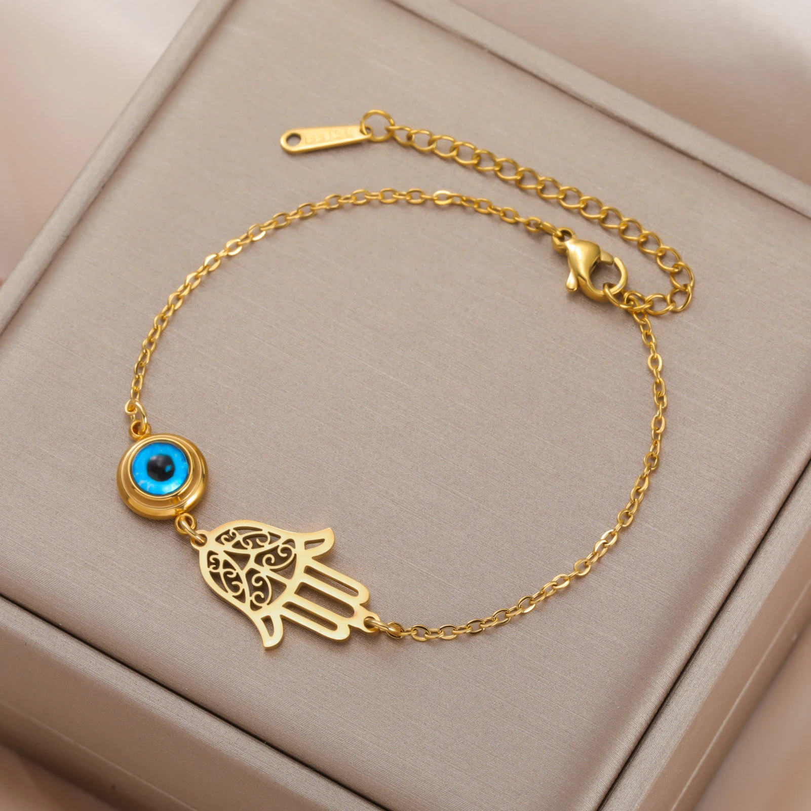Blue Eye Hamsa Hand Bracelet – Gold Charm Jewellery for Women