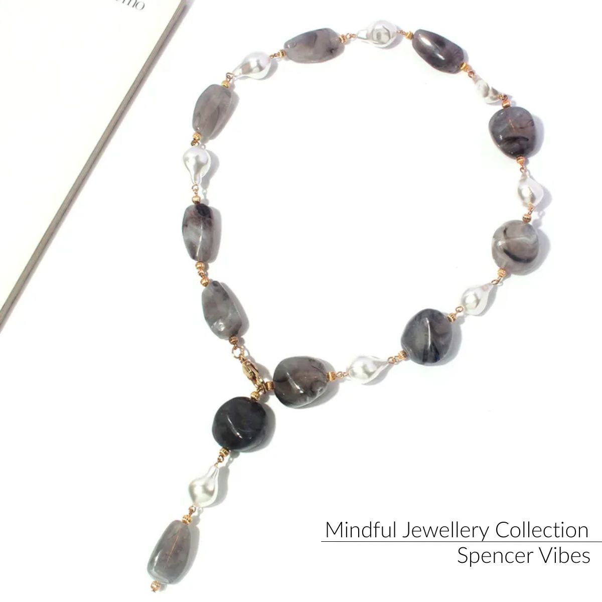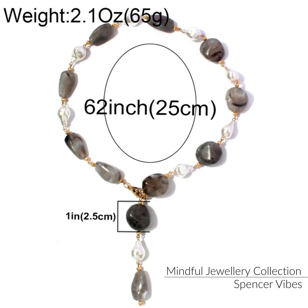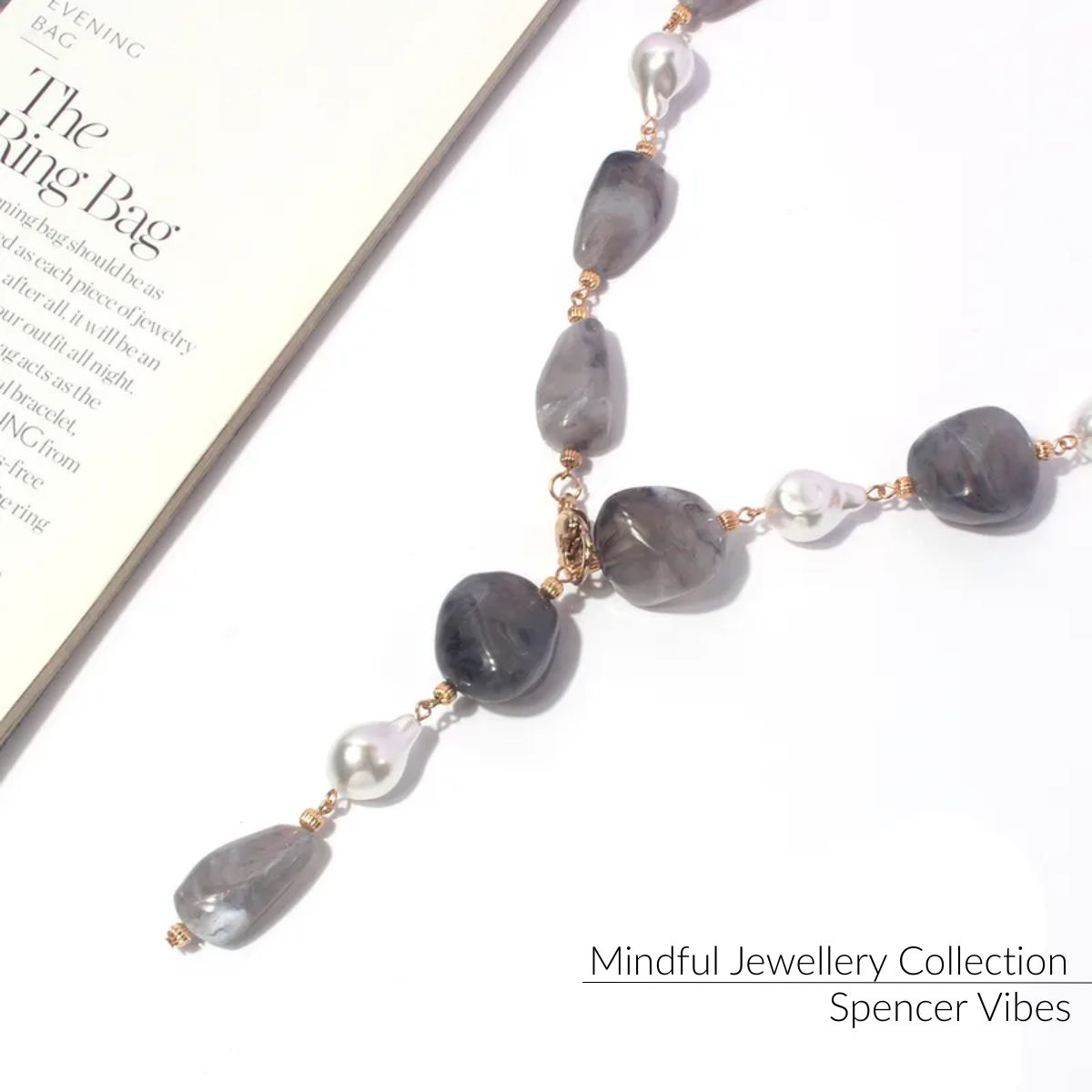 The Cloud Drift Necklace brings together gentle movement, natural texture, and vintage-inspired elegance. Smooth grey stones form the main strand, while irregular pearl drops add contrast and light. Together, they create a long necklace that feels expressive yet calm.