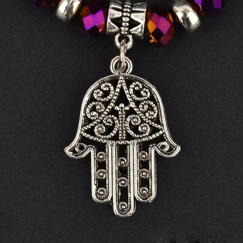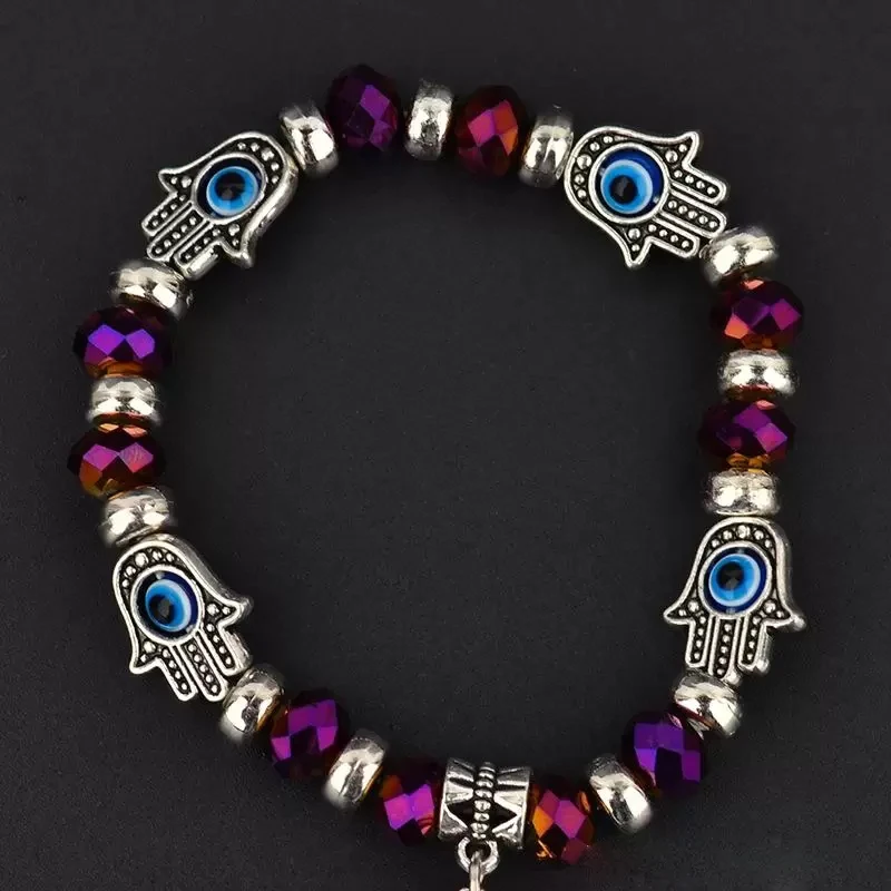 A bold and colourful bracelet featuring faceted beads, detailed Fatima palm charms and a blue eye motif. With a comfortable stretch fit and a decorative centre charm, it’s an expressive everyday accessory that adds personality to any look.