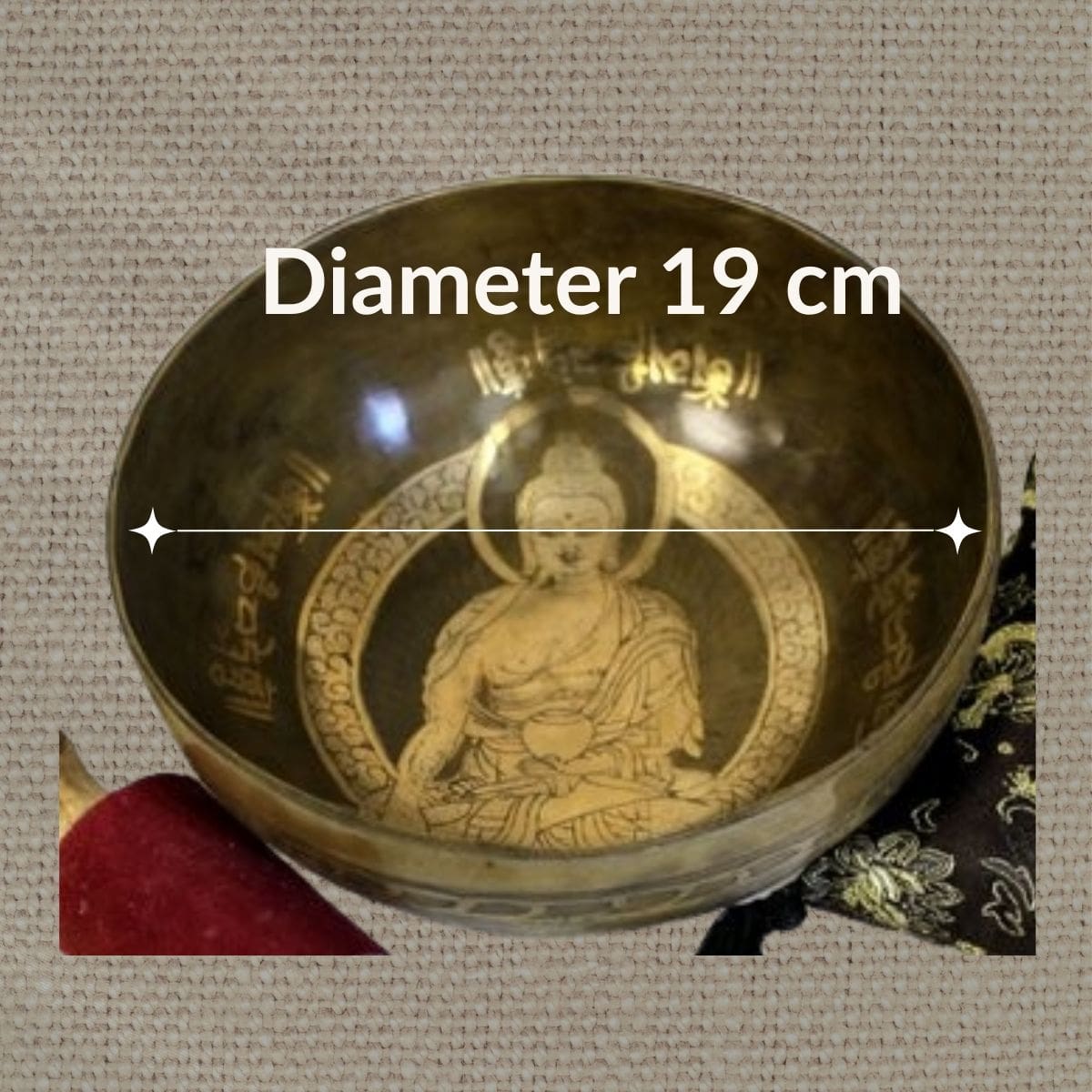 The set includes a brass bowl with a golden Buddha design, a matching cushion, and a suede-coated wooden stick. When the wooden end is drawn gently around the rim, the bowl produces a sustained tone. Alternatively, the padded end can be used for a soft, resonant strike. As a result, the bowl offers two distinct sound experiences using the same tool.