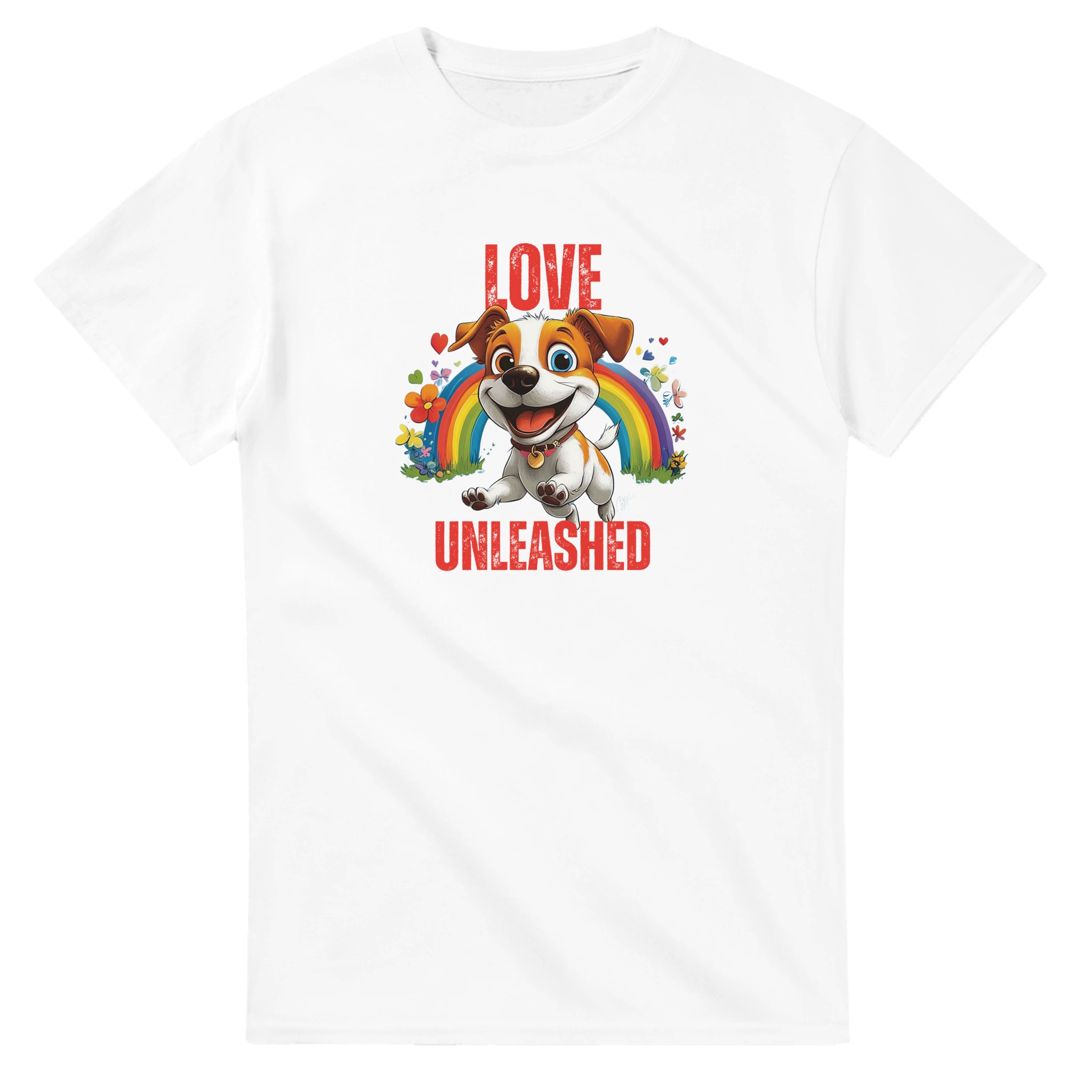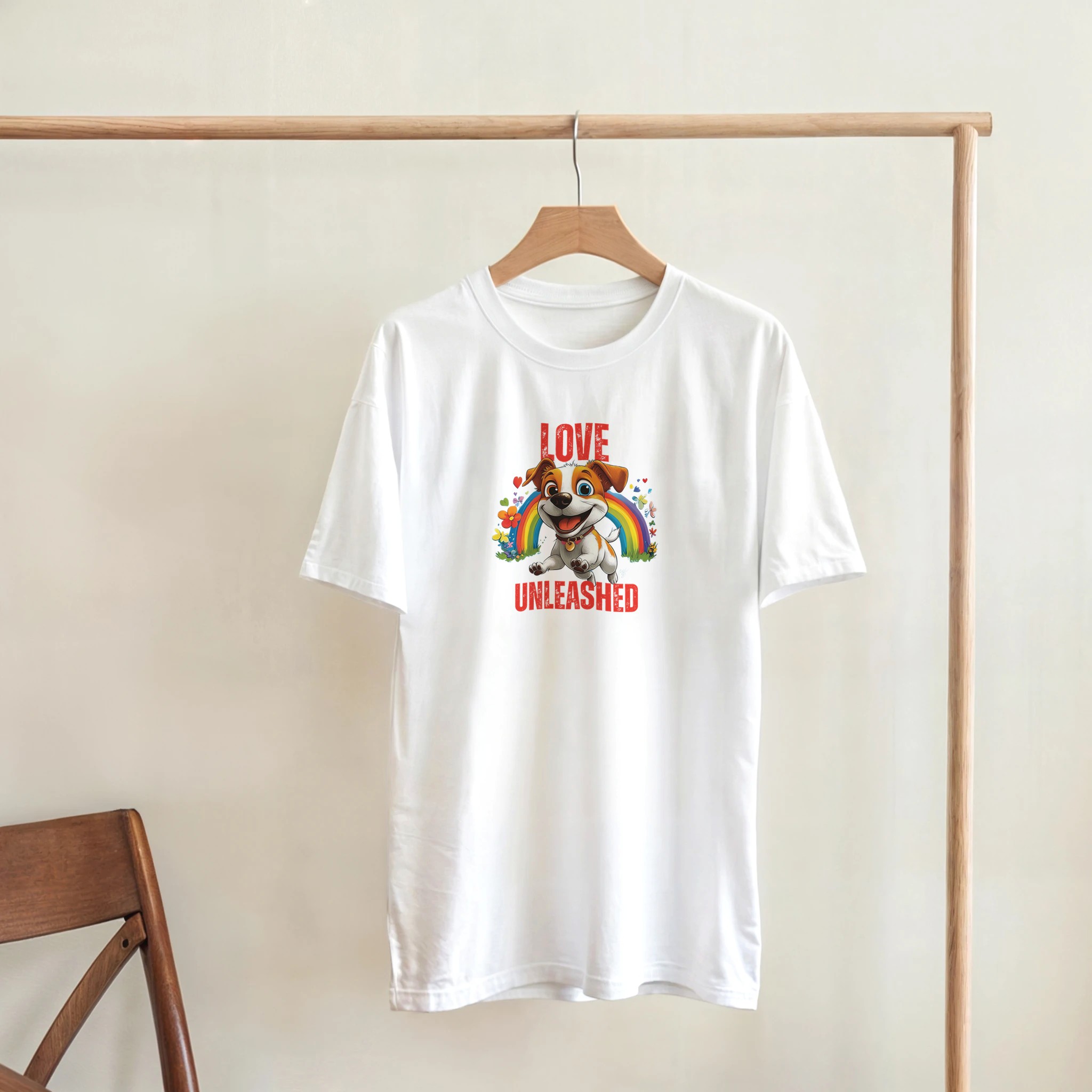 Spread positivity wherever you go with the Love Unleashed T-Shirt, featuring a playful design of a joyful dog leaping in front of a rainbow — a perfect reminder that happiness is best when shared freely. Bright, cheerful, and full of character, this shirt brings a touch of optimism and warmth to any casual outfit.