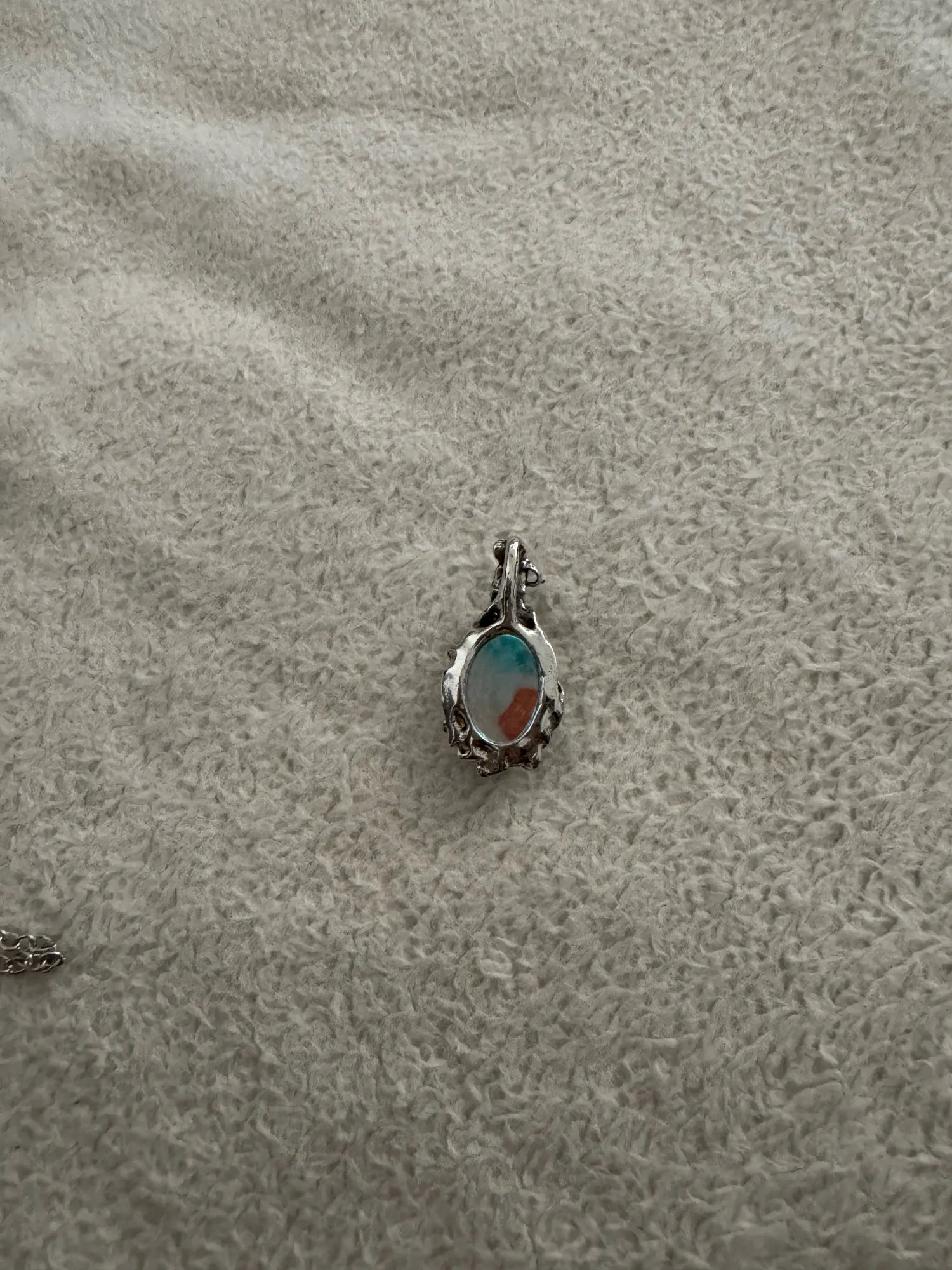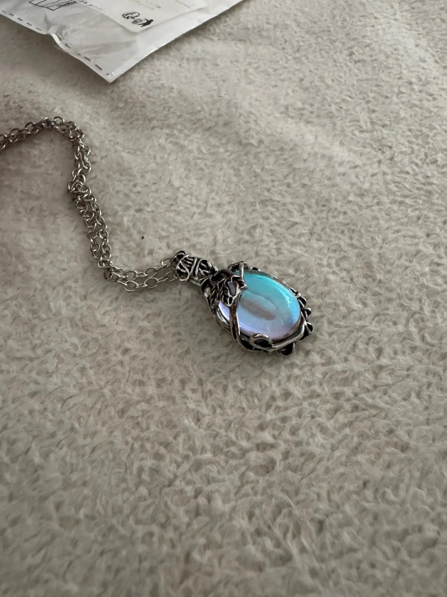 The Antique Moonstone Pendant Necklace combines vintage silver curves with a softly glowing artificial moonstone. A graceful moonstone-inspired necklace that adds quiet elegance to everyday wear.