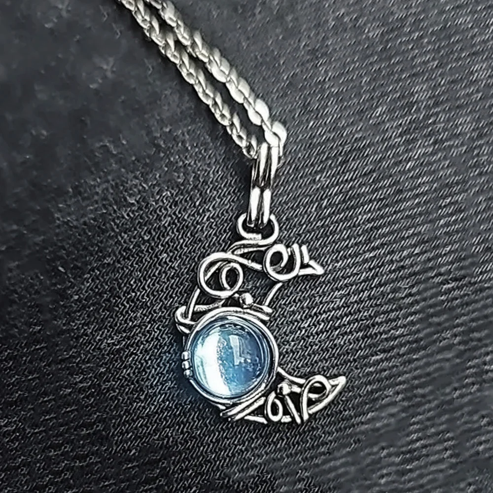 The Antique Moonstone Pendant Necklace captures the quiet beauty of the night sky in a timeless design. Its luminous artificial moonstone shimmers with hints of blue and white, set within an intricate crescent frame of vintage-style silver metalwork.