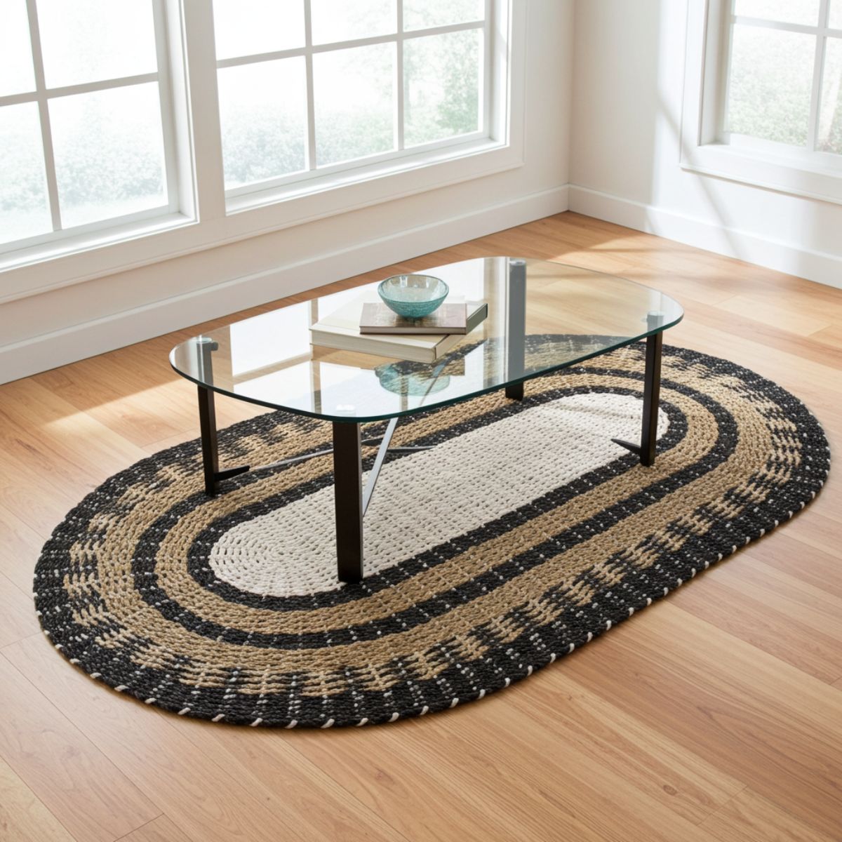 This oval seagrass rug features a classic woven design using black, white, and natural tan fibres. The contrasting tones add definition and visual interest, while the oval shape softens the look of narrow or linear spaces. It brings texture and balance without overwhelming the room.