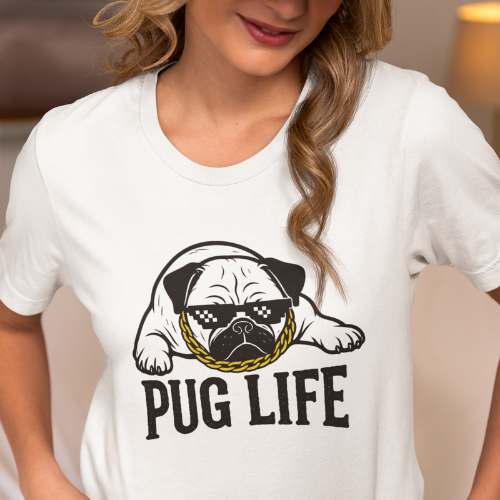 - Bold graphic design with a pug in sunglasses and a gold chain—because dog lovers deserve drip too
