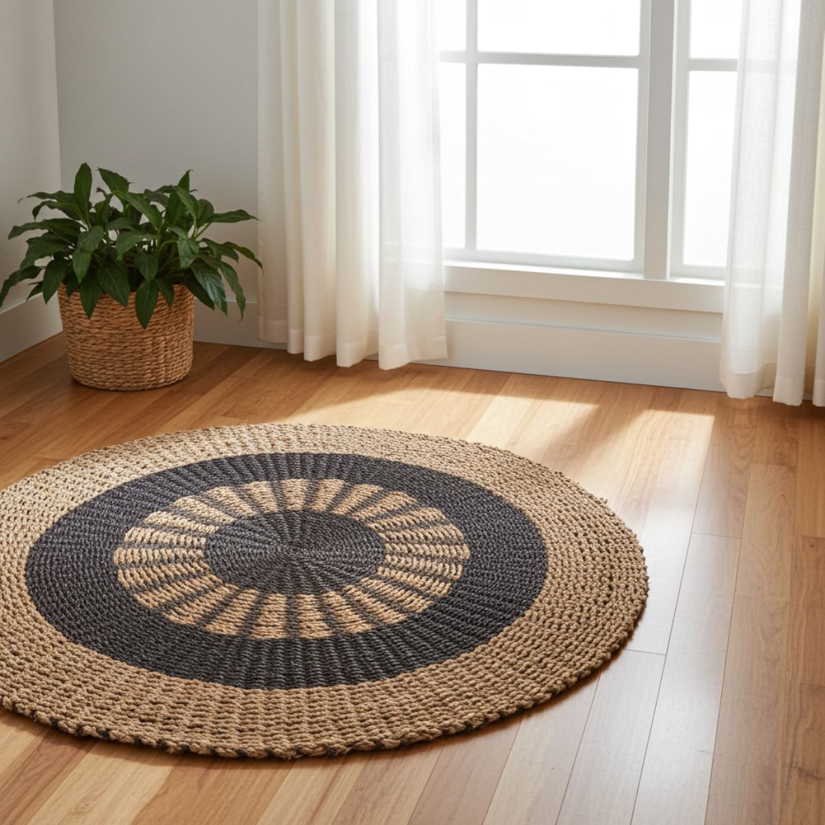 A round seagrass rug in black and tan with a striking inner sun woven design. Durable, easy to maintain, and ideal for living rooms, dining areas, hallways, and other busy spaces.