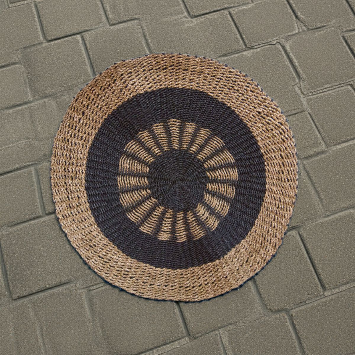 Round seagrass rug in black and tan tones