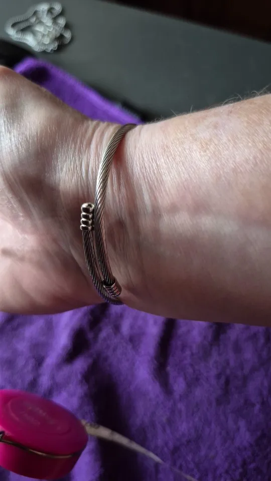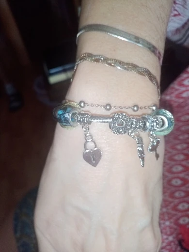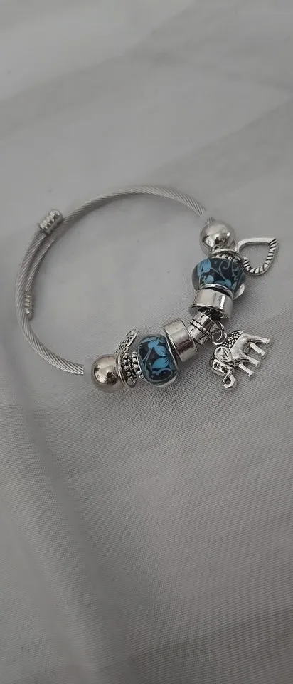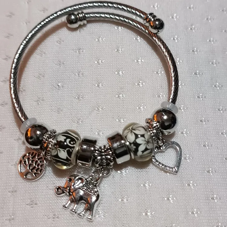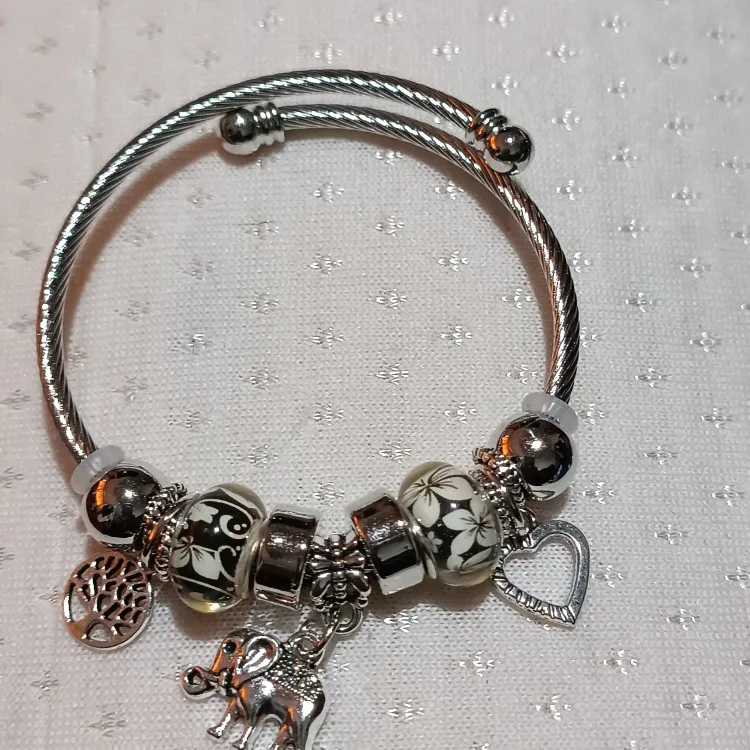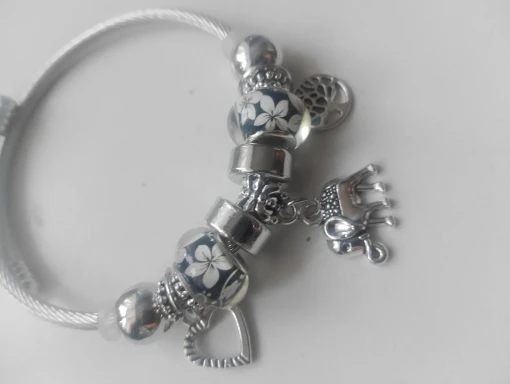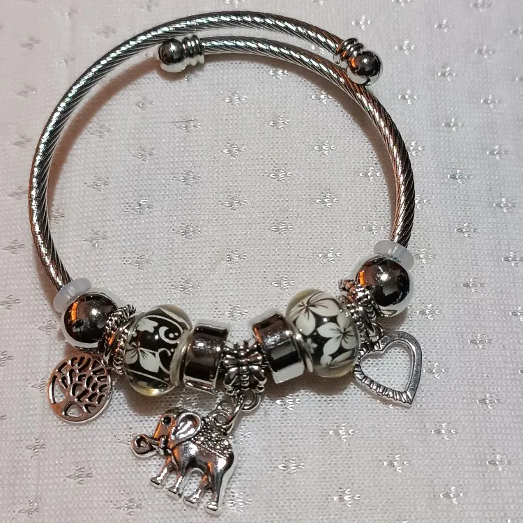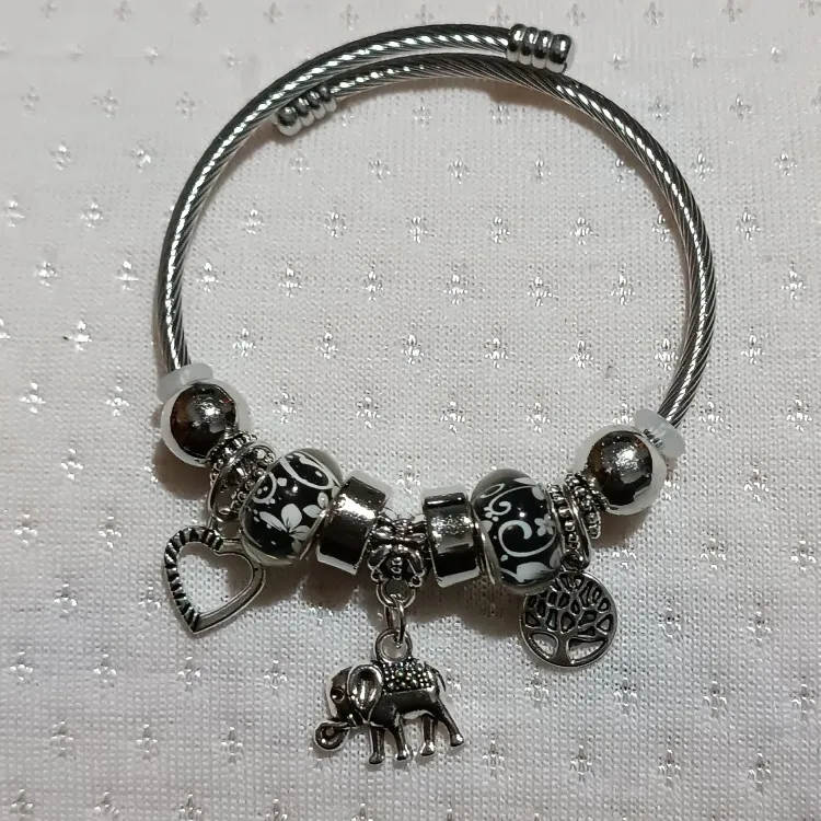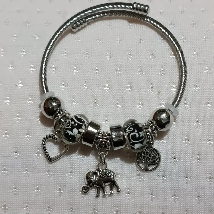 With its flexible wire design, this silver charm bracelet offers a comfortable fit while maintaining timeless sophistication. The intricate enamel accents and polished beads make it perfect for everyday wear or as a thoughtful, meaningful gift.