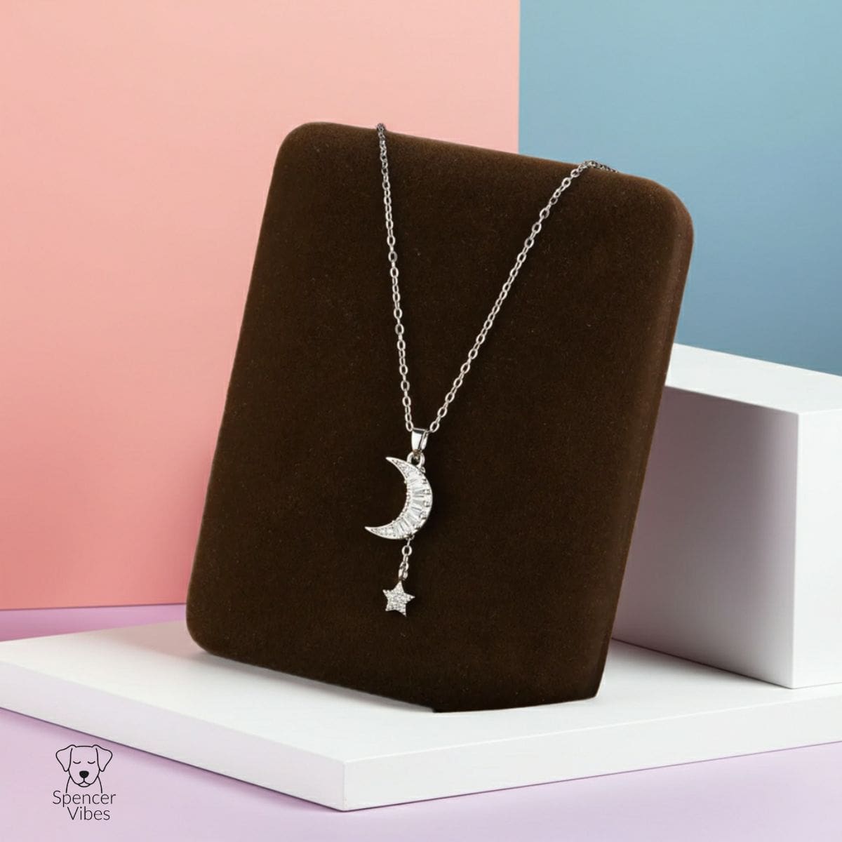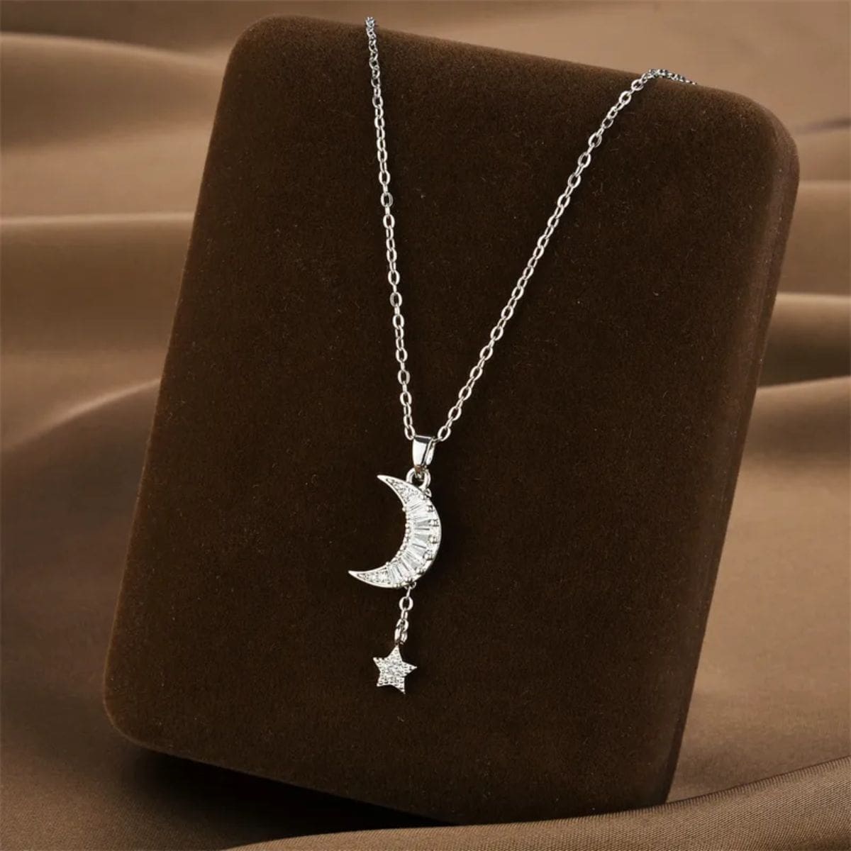 This silver-tone necklace features a crescent moon pendant with a small star detail below. The design is simple, balanced, and easy to wear.