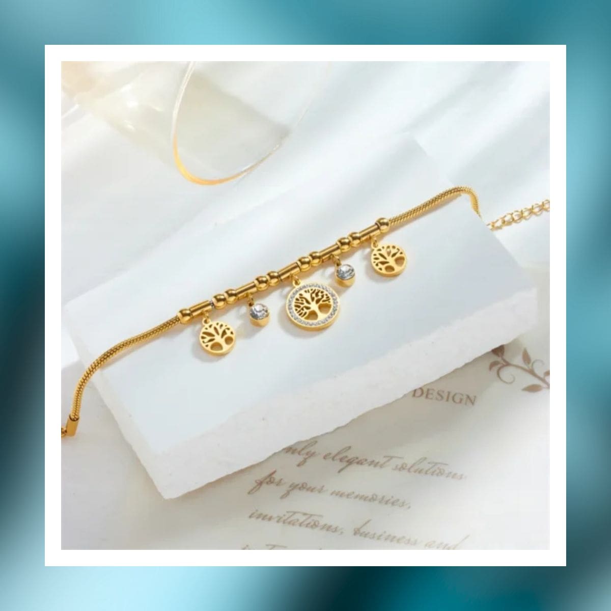 Symbolising growth and connection, this gold charm bracelet combines modern elegance with meaningful detail. The adjustable clasp ensures a comfortable fit, making it perfect for both everyday wear and special occasions.