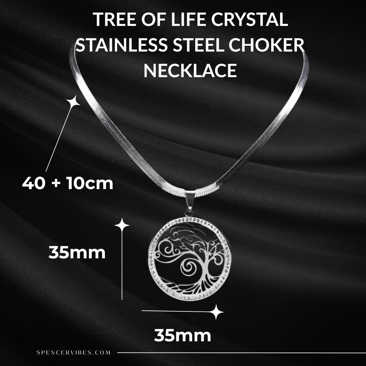 This stainless steel choker necklace features a tree-style pendant with crystal accents and a polished modern finish. It offers a sleek, contemporary look that works effortlessly with everyday outfits.