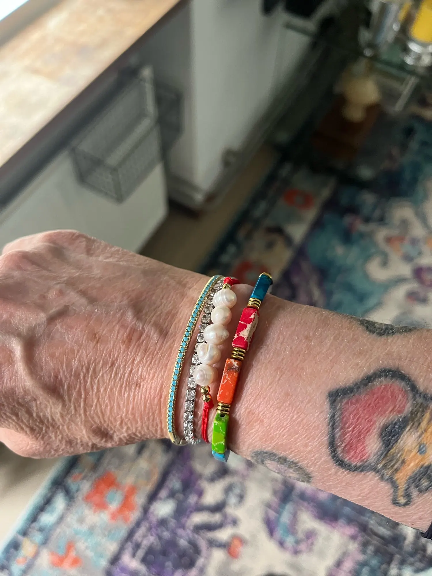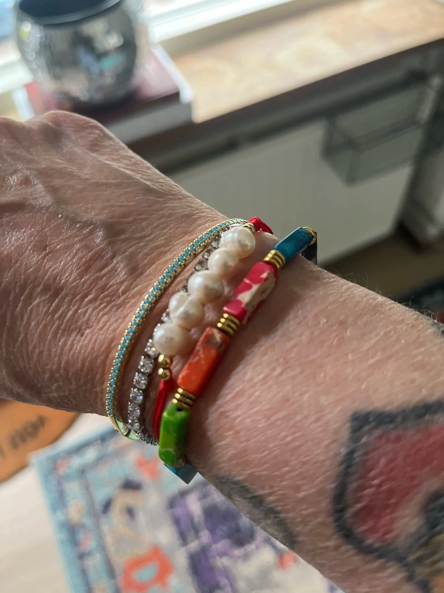 The Turquoise Stone Beaded Bracelet celebrates colour, craftsmanship, and individuality. Featuring rectangular beads in vibrant shades of turquoise, coral, and jade, this piece brings a natural warmth and easygoing charm to any look.