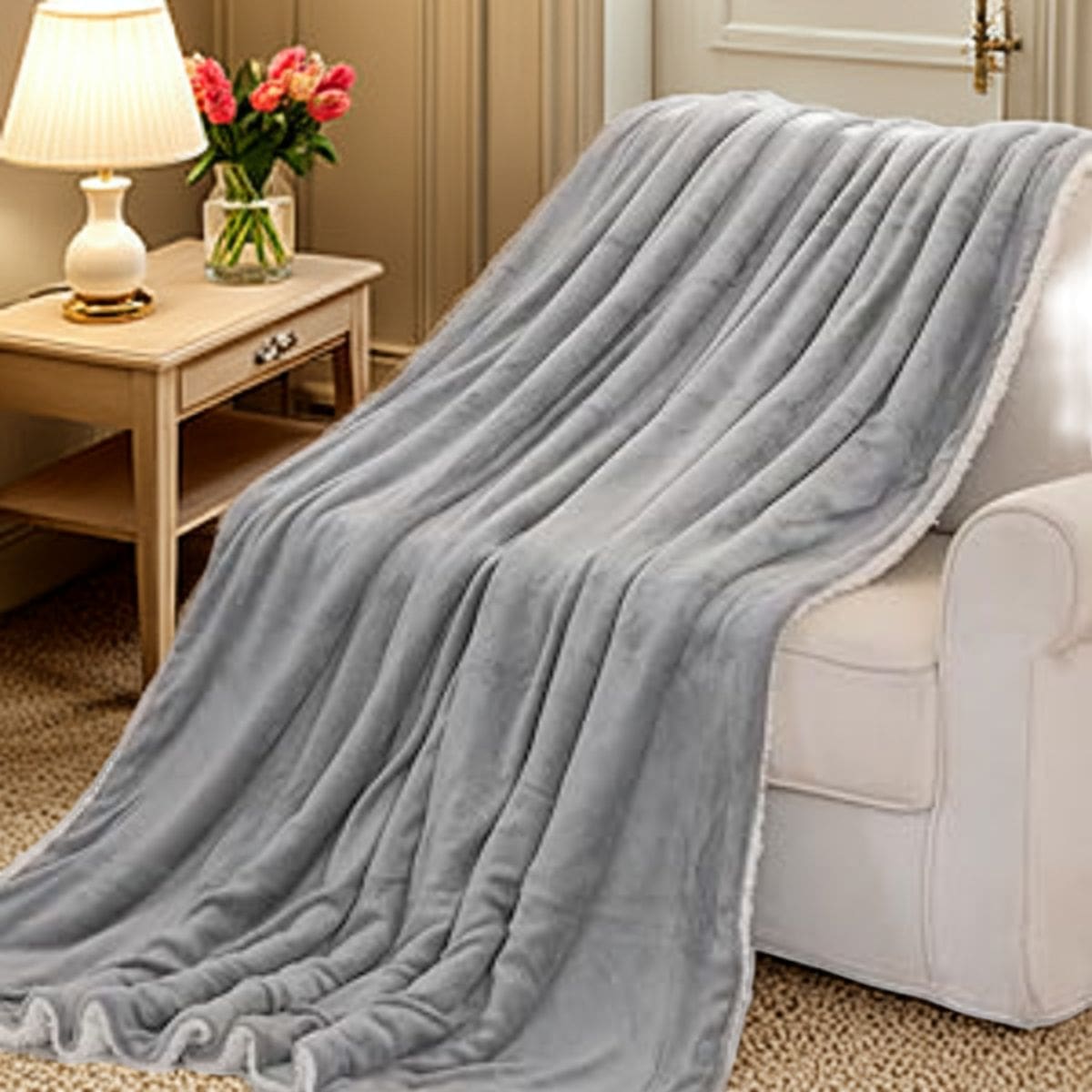 This ultra-soft sherpa fleece blanket is designed for moments when life slows down. Finished in a calm grey tone, it brings visual stillness as well as physical comfort—whether draped across a sofa, folded at the foot of the bed, or wrapped around you on cooler evenings.